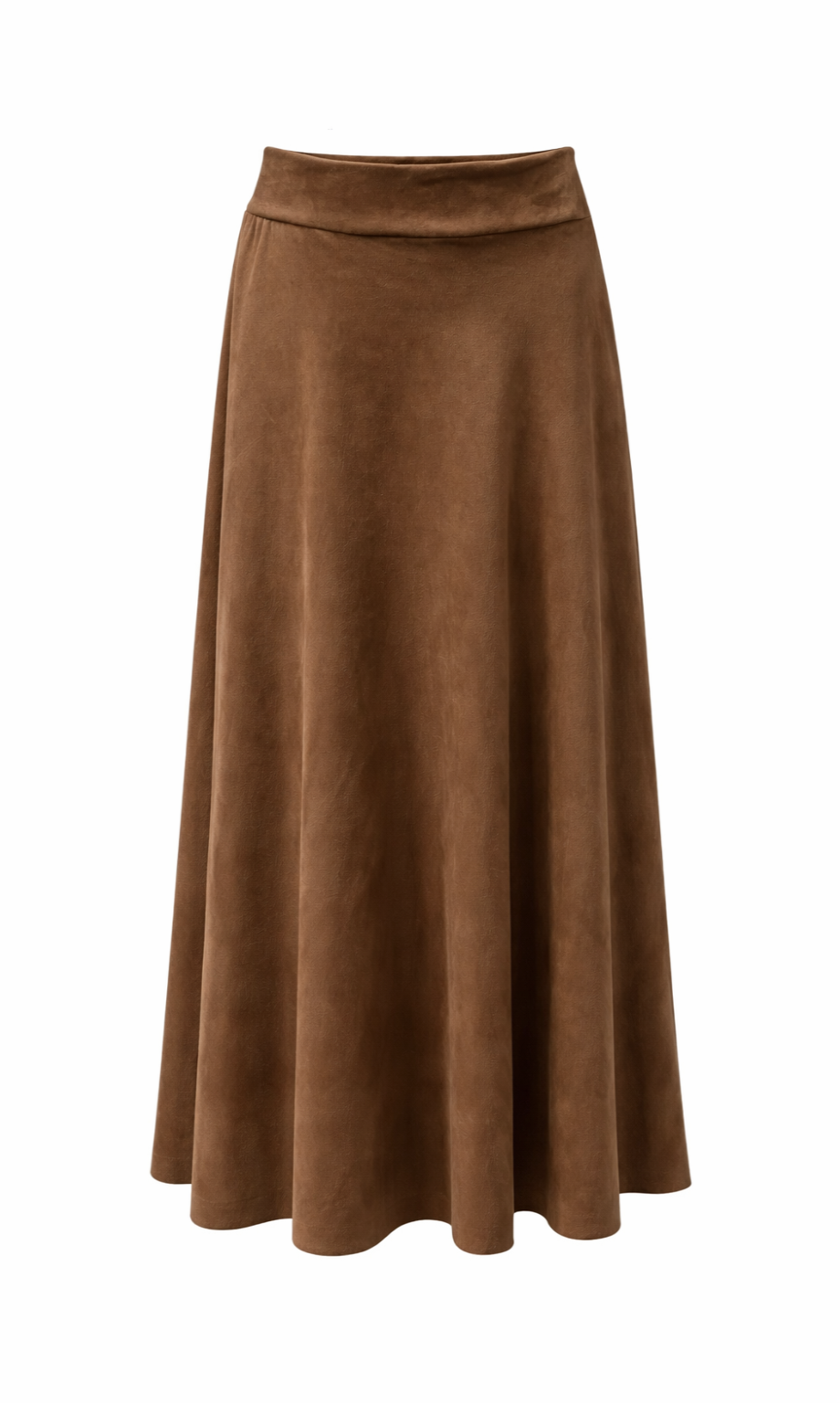 Μακριά φούστα από σουέντ σε ζεστή ταμπά απόχρωση, με απαλή υφή που αγκαλιάζει όμορφα τη σιλουέτα. Η ροή του υφάσματος προσφέρει άνεση και κομψότητα, ενώ η ουδέτερη απόχρωση την καθιστά εύκολη στο συνδυασμό με διάφορα τοπ και παπούτσια. Ιδανική για casual αλλά και πιο εκλεπτυσμένες εμφανίσεις, προσφέροντας διαχρονικό στυλ και κομψή αισθητική.