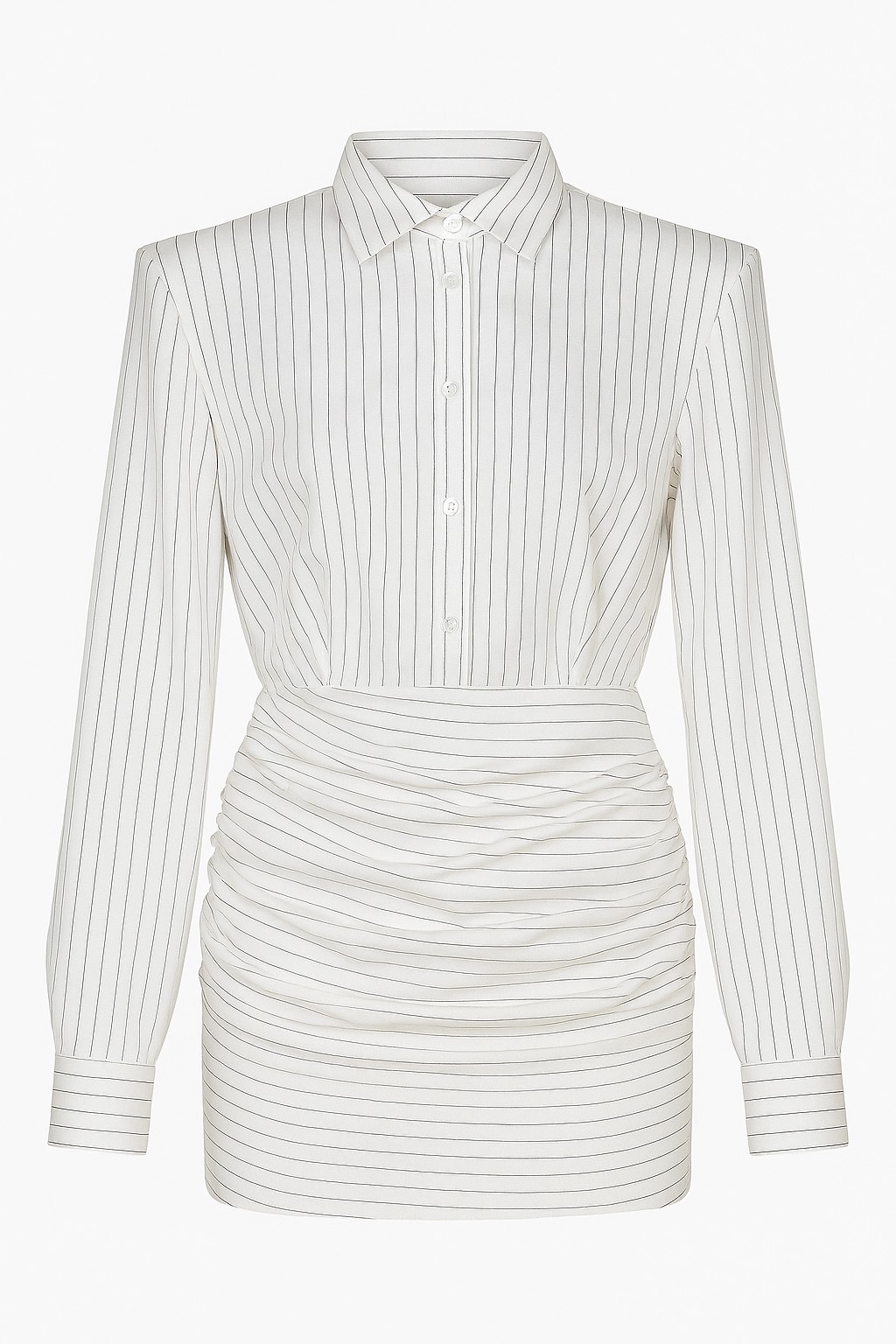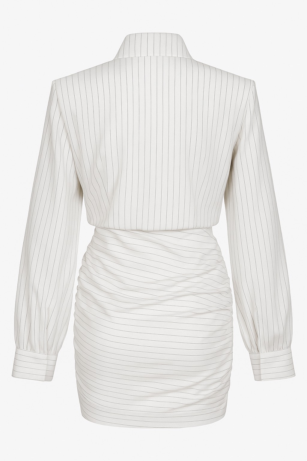 Mini φόρεμα τύπου πουκαμίσα με κάθετες ρίγες σε off-white βάση και έντονους ώμους με βάτες. Διαθέτει μακρύ μανίκι, κλασικό γιακά και κουμπιά μπροστά. Η εφαρμογή στη μέση με σούρες αναδεικνύει τη σιλουέτα, συνδυάζοντας ανδρόγυνο tailoring με θηλυκή γραμμή.